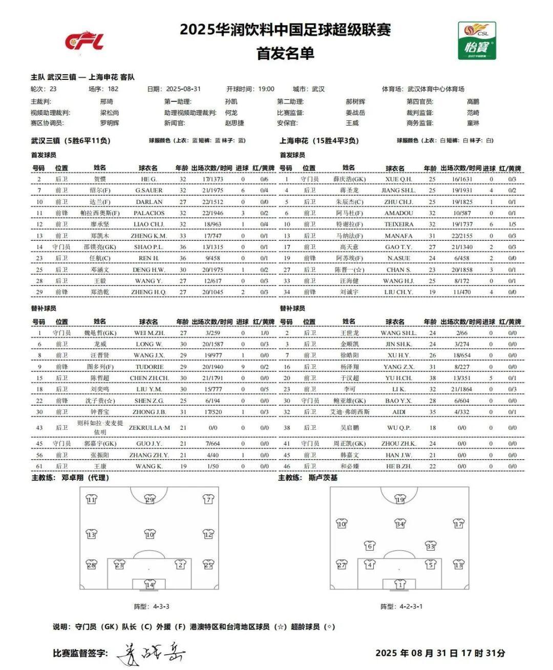 面对整体实力强于自身的上海申花队,武汉三镇队教练组一直琢磨用怎样的阵容和战术来迎战对手。本场比赛首发阵容武汉三镇队变阵了,从之前的4231变阵为541,且首发阵容中出现了不少替补球员的身影——郑浩乾从左边前卫前移到中锋位置,顶替图多列;后腰位置上,达兰和廖承坚出任双后腰组合;后防线上,郑凯木从后腰位置后移,与贺惯和任航一起出任三中卫,王毅则顶替陈哲超出任左边后卫。这样一个出乎所有人意料的首发阵容,也让对手上海申花队摸不着头脑。